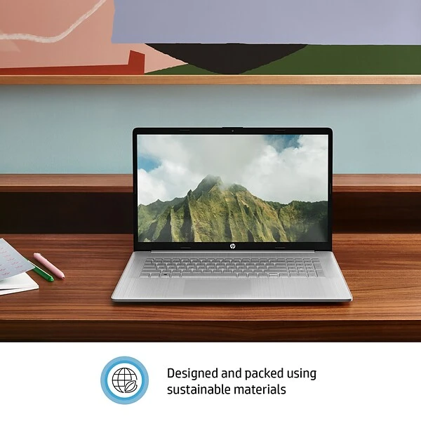 The HP 17″ laptop is thoughtfully designed and delivers performance with an Intel processor, fast Wi-Fi technology, and loads of storage. Enjoy a more natural and comfortable typing position with the lift-hinge design and enlarged click pad. The laptop design includes sustainable materials like ocean-bound plastic and from post-consumer recycled plastic.