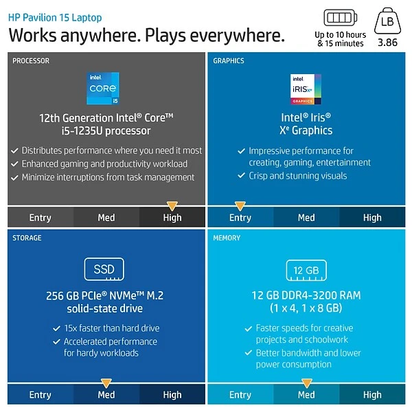 - Features a 3.3GHz Intel Core i5-1235U 10-core processor with up to 4.4GHz speed and 12MB cache memory