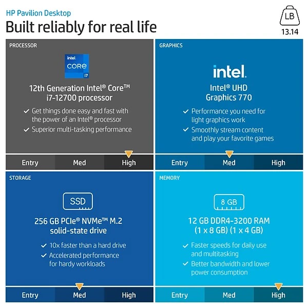 Built for all your computing activities, the HP Pavilion desktop PC combines high performance with a tested and reliable design. Power through your to-do list with a high-performance processor, and stay connected with integrated Bluetooth 5.2 technology. Brighten up any space thanks to this PC’s snow-white finish, and complete your setup with multiple front-facing ports. Windows 11 provides a calm and creative space where you can pursue your passions through a fresh experience. From a rejuvenated Start menu, to new ways to connect to your favorite people, news, games and content, Windows 11 is the place to think, express, and create in a natural way. A 12th Gen Intel Core processor distributes performance where you need it the most, saving you time and increasing your ability to do the things you actually want. Because little things make a big difference, this product includes sustainable materials like water-based paint in the design. Boot up in seconds with lightning fast speed with the 256GB PCIe SSD storage. Life can be unpredictable, but your HP desktop shouldn’t be. Backed by over 230 individual tests, this desktop has gone through it all to deliver durability you can trust and reliability you can count on.