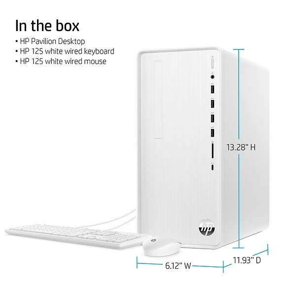 - What’s in the box? HP Pavilion, HP 125 white wired keyboard, HP 125 white wired mouse
