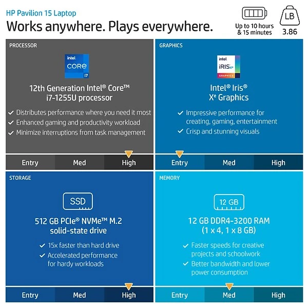 - Features a 3.5GHz Intel Core i7-1255U 10-core processor with up to 4.7GHz speed and 12MB cache memory