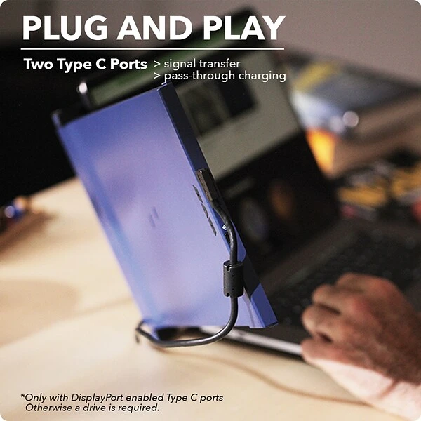 - 2 USB Type-C ports (1 port video transmission and 1 port power delivery) with hybrid-signal Input using DP Alt and USB signals using laptop USB-C or USB-A 3.0 port