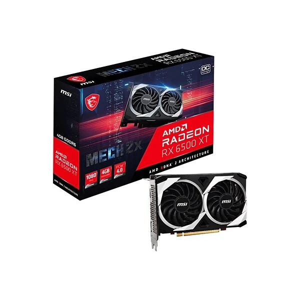 The MSI MECH 2X 4G OC Radeon RX 6500 XT graphics card features the breakthrough AMD RDNA 2 architecture and is engineered to deliver great gaming performance with remarkable efficiency. Blaze a trail into tomorrow, dive into 1080p gaming, enjoy vivid virtual worlds, and elevated experiences with the power of next-generation graphics.