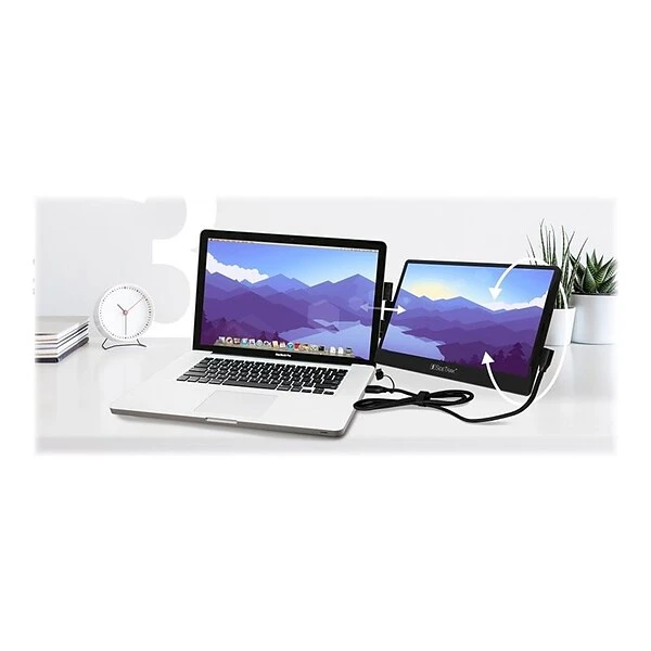SideTrak Swivel is a 12.5″ Full HD IPS portable monitor that securely attaches to the back of your laptop with a device-safe metal plate. This portable monitor does not require a download and is compatible with most devices and operating systems including macOS, Windows Chrome, PS4, Xbox, and Switch. Its compact, innovative attachment is designed to fit any laptop size.