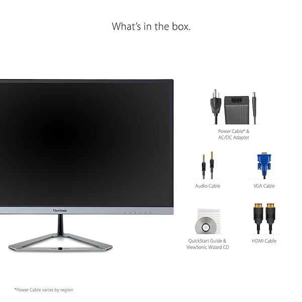 - INCLUDED IN THE BOX: LCD Monitor, Power Cable, AC/DC Adapter, HDMI Cable, VGA Cable, and Audio Cable