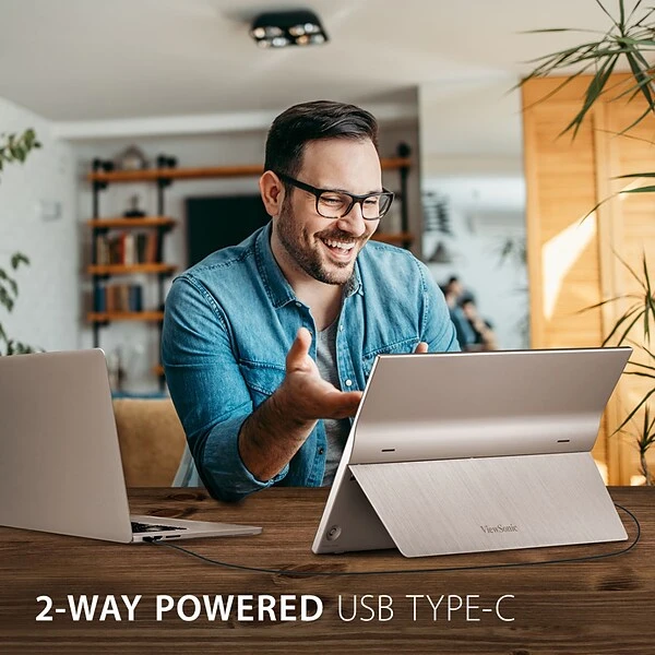 The ViewSonic VG1655 is a portable 15.6-Inch monitor designed for productivity on the go. Built for business travelers, remote workers, and digital nomads, the VG1655 can serve as a complementary screen to a laptop or tablet for boosted productivity. With an anti-glare screen and Full HD 1080p resolution, this monitor delivers a crystal-clear viewing experience so users can see more and do more for a more efficient workflow. A USB Type-C port enables quick and easy transmission of video, and audio. A second USB Type-C port also delivers up to 60W of two-way power: a connected laptop can power the VG1655, OR the VG1655 can power a connected laptop via a USB-C power bank or AC adapter and outlet. Measuring less than an inch thick and weighing under two pounds, the ultra-slim VG1655 perfectly fits into any bag, briefcase, or backpack so you can work wherever life takes you.